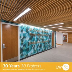 The UIC College of Nursing Simulation Lab renovation offers a state-of-the-art medical education facility with a modern, bright design. Featuring bold teal accents and wood elements, the space evokes a natural healing ambiance. Distinct student areas include power-outlet-equipped seating, a welcoming media wall area, and a student lounge. The cutting-edge lecture spaces and simulation labs provide hands-on learning in a controlled environment, promoting interaction and collaboration. Thanks to our client University of Illinois at Chicago, subconsultants Maestros Ventures and Rodriguez and Associates, as well as our photographer James Steinkamp.